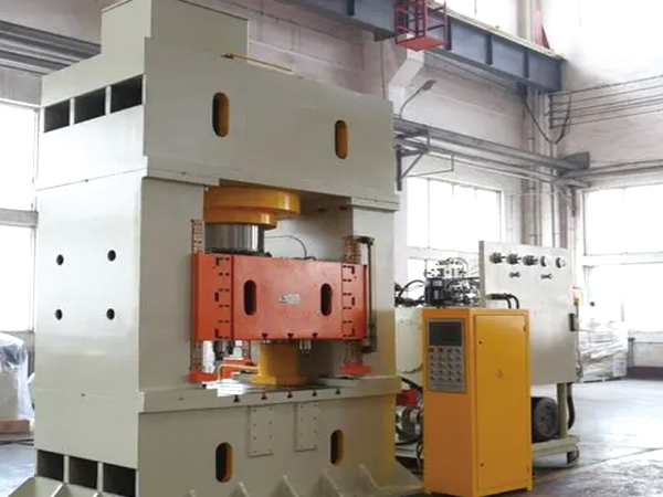 630噸框架式液壓機的整體框架或組合框架結構,均為全鋼板焊接;四角八面直角導軌導向、精度高,剛性好,并采用液壓預緊。液壓系統采用二通插裝集成閥;整個系統工作穩定、可靠、使用壽命長、泄露少、故障點少。電器系統采用“PLC”可編程控制器控制,并可根據用戶要求配置比例調壓、行程數顯、光電保護裝置及移動工作臺(方便更換模具)。該系統液壓機具有上滑塊及下液壓墊的雙動功能,根據用戶要求液壓墊可設為頂出器,也可作拉伸之用。因此,工藝范圍廣,可完成金屬薄板拉伸、彎曲、沖裁(可配緩沖裝置)等工藝。