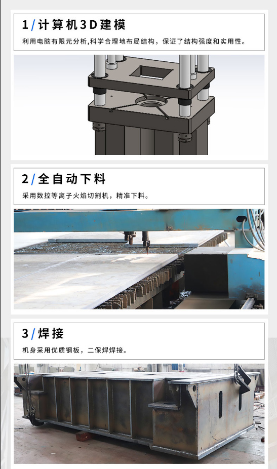 150噸龍門液壓機采用龍門架全鋼性結構,經振動時效處理使機械變形量小,機架設計經由有限元設計,具有高剛性、高精度。龍門式液壓機工作臺能上下移動,擴展了機器開合高度,使用更方便。由主缸、液壓動力系統及電器系統等部件組成。工作臺采用優良鋼板焊接而成,確保可靠性和耐用性。
